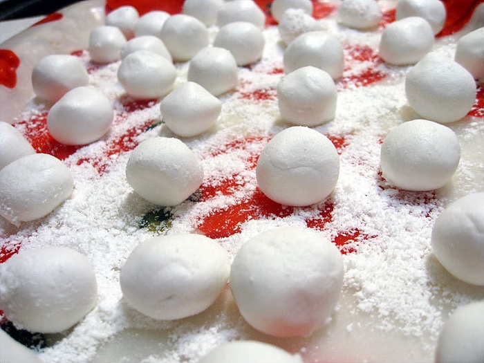 # 찹쌀가루를 뜨거운 물에 반죽하여, 메추라기알 정도의 크기로 빚어 경단을 만든다.