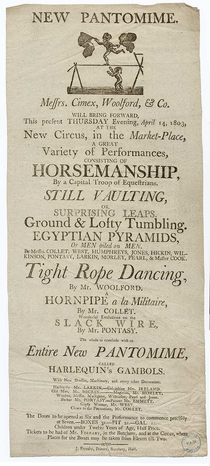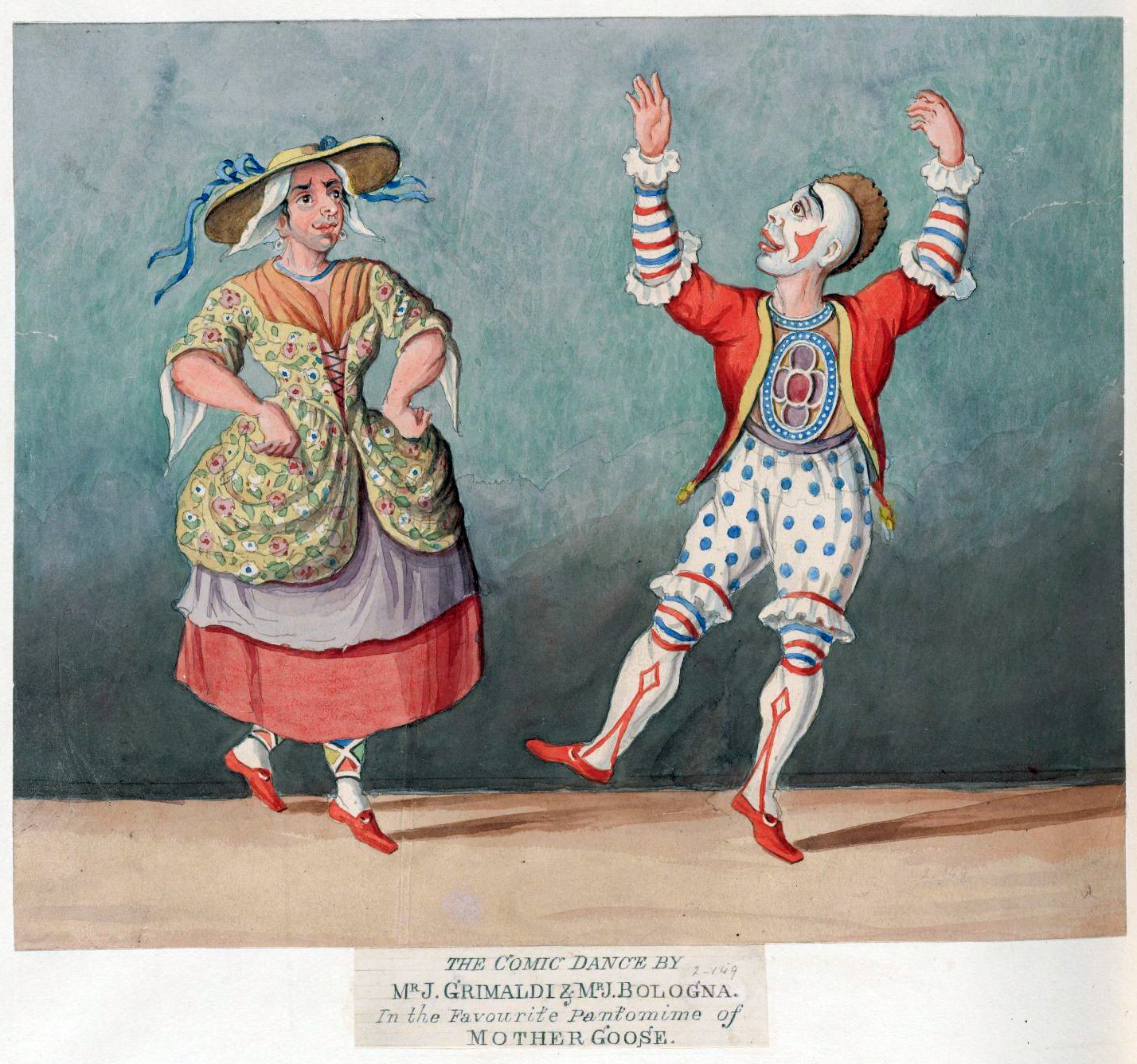 1800년대에는 아이들이 크리스마스와 새해 연휴에 주로 할리퀴네이드 추격 장면을 보기 위해 극장에 갔다. 이 쇼의 일부에 슬랩스틱이 등장한 것은 이탈리아 코메디아 델라르테의 캐릭터에서 유래되었다.[17] 할리퀴네이드의 줄거리는 사랑에 빠진 남녀 할리퀸과 콜럼바인이 콜럼바인의 아버지 판탈론으로부터 도망치고, 판탈론은 하인 광대와 경찰에게 방해받으며 그들을 쫓는 내용이었다. 그리말디 이후, 광대는 연인들을 방해하는 주요 책략가가 되었고, 판탈론은 그의 조수가 되었다.[33]