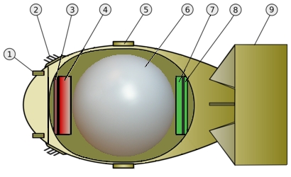 - 중성자 점화기: 플루토늄의 핵분열 반응을 시작하기 위한 최초의 중성자를 방출하는 장치이다. 베릴륨과 폴로늄-210으로 구성되었다.[5]