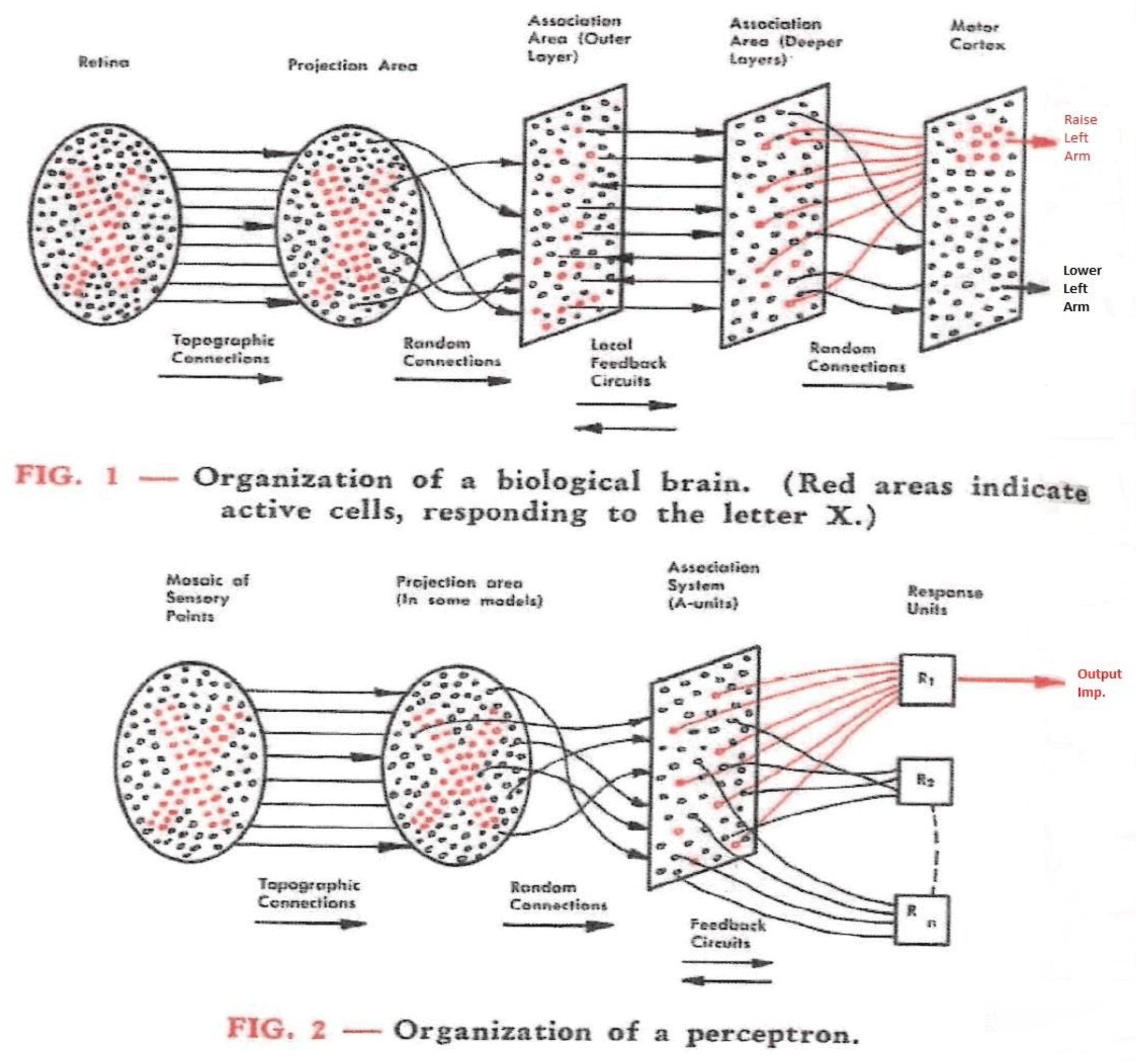 로젠블랫은 1958년 논문에서 퍼셉트론의 세부 내용을 설명하고,[7] "투영", "연관", "응답"을 나타내는 AI, AII, R 세 가지 종류의 셀("유닛")로 구성됨을 밝혔다. 그는 1958년 11월에 열린 최초의 국제 AI 심포지엄인 "''사고 과정의 기계화''"에서 이를 발표했다.[8]