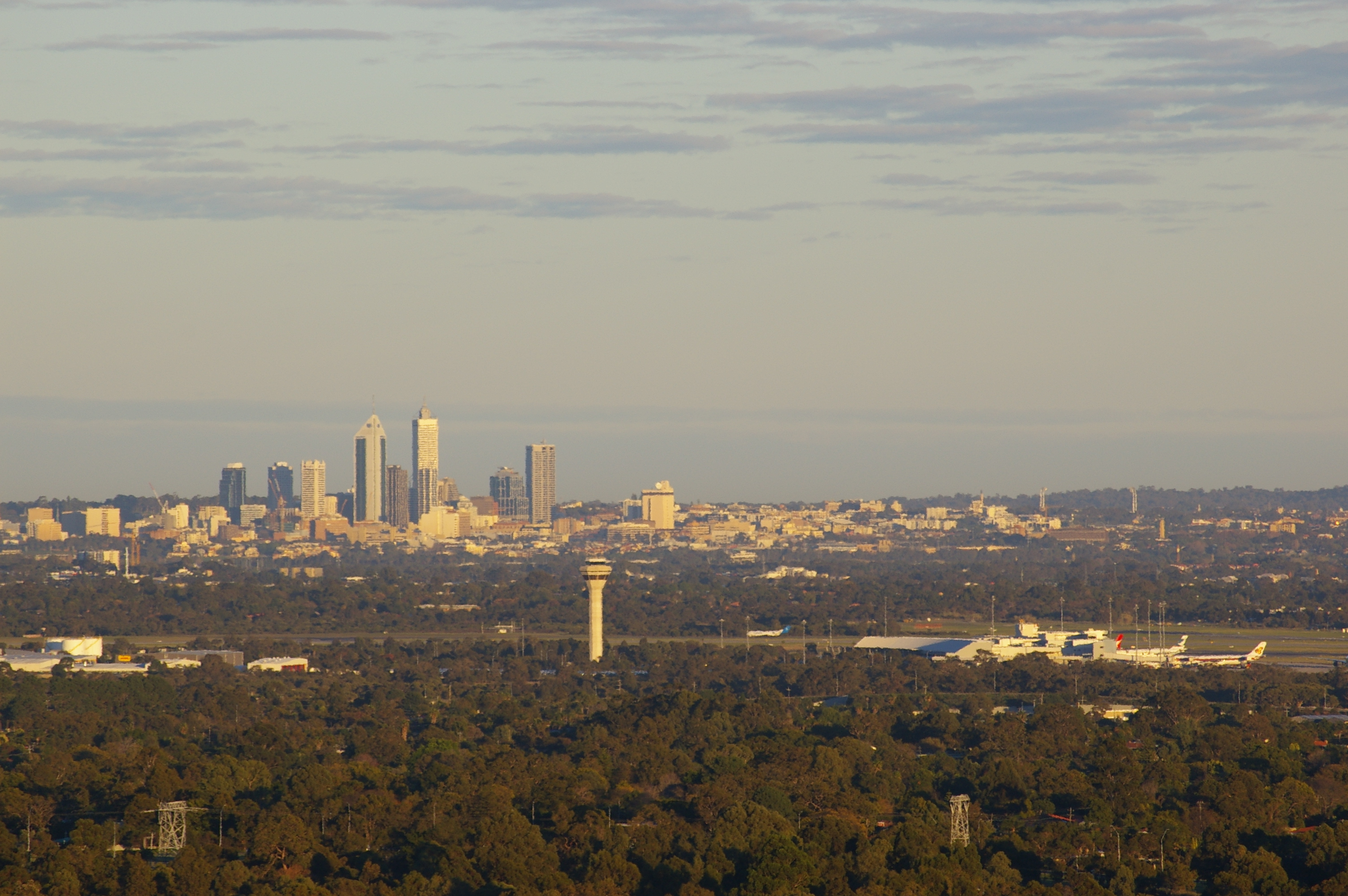 퍼스 공항, 뒤편으로 시내가 보임. 덜링 스카프(Darling Scarp)에서 서쪽을 바라보며 촬영