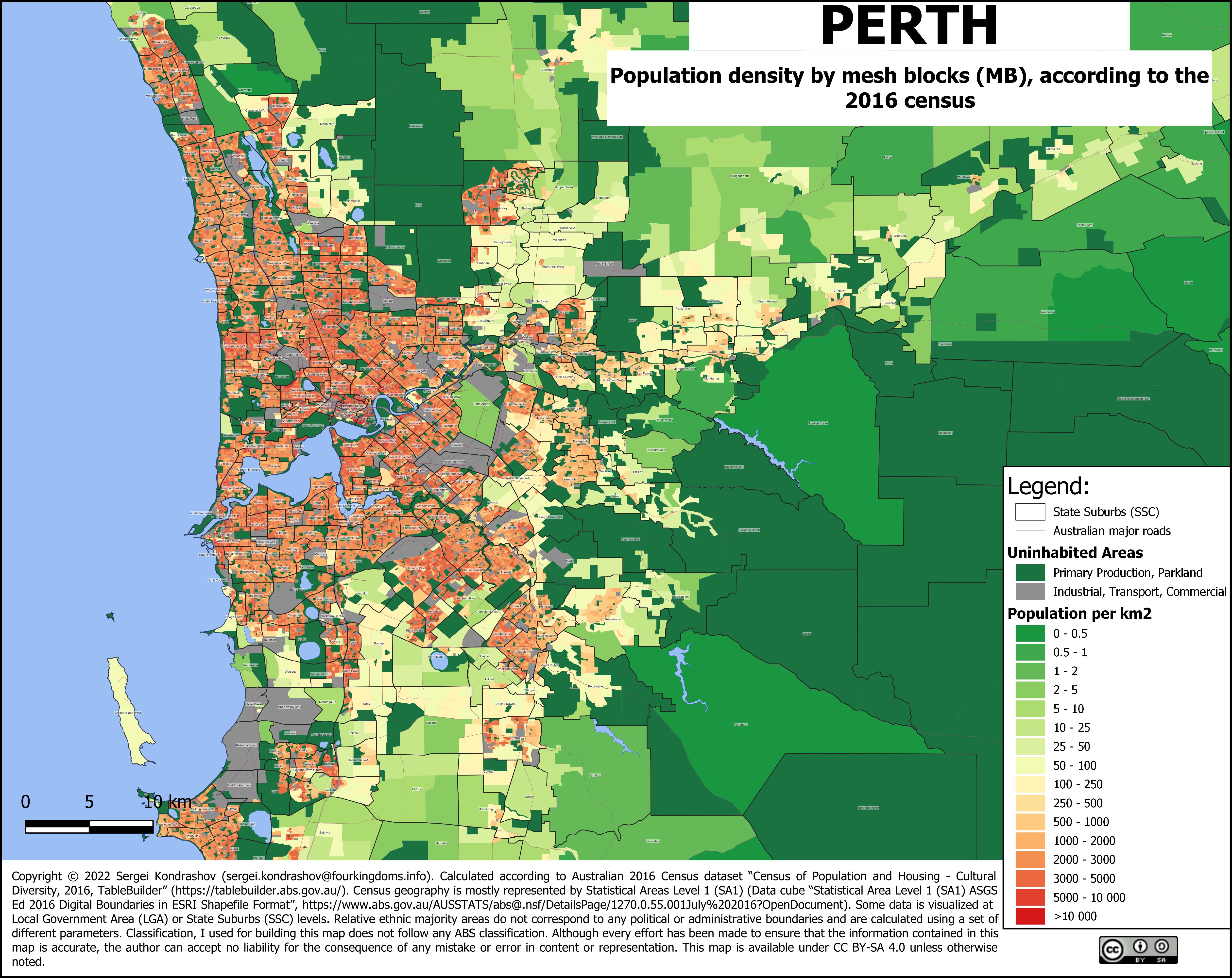 도시권(都市圏)은 북쪽으로 와너루(Wanneroo), 남쪽으로 로킹엄(Rockingham)으로 남북으로 약 125km, 서쪽 해안에서 동쪽 먼더링(Mundaring)까지 동서로 약 50km에 걸쳐 펼쳐져 있다.