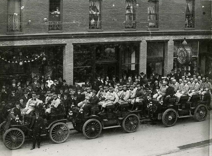 1903년 개막일에 오클랜드 오크스 원정팀 선수들이 새크라멘토 세너터스와의 경기를 위해 야구장으로 이동할 준비를 하고 있다.