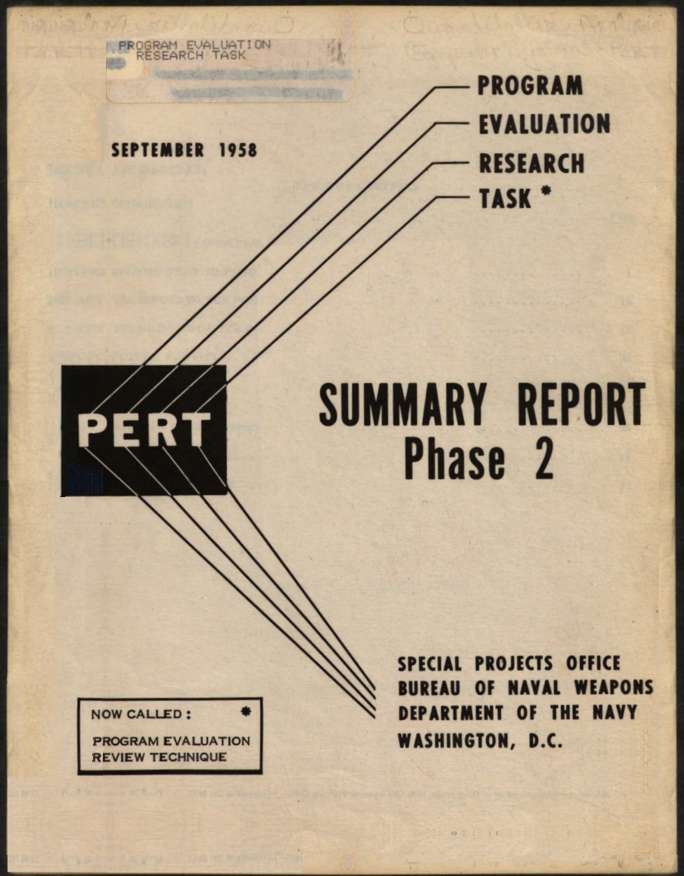 초기에 PERT는 ''프로그램 평가 연구 과제''(Program Evaluation Research Task)의 약자였지만, 1959년까지 명칭이 변경되었다.[2] 1958년 미국 해군성은 ''프로그램 평가 연구 과제, 요약 보고서, 1단계''[4] 및 ''2단계''라는 두 개의 간행물을 통해 이 내용을 공개했으며, 두 보고서 모두 주로 찰스 F. 클라크가 작성했다.[1]