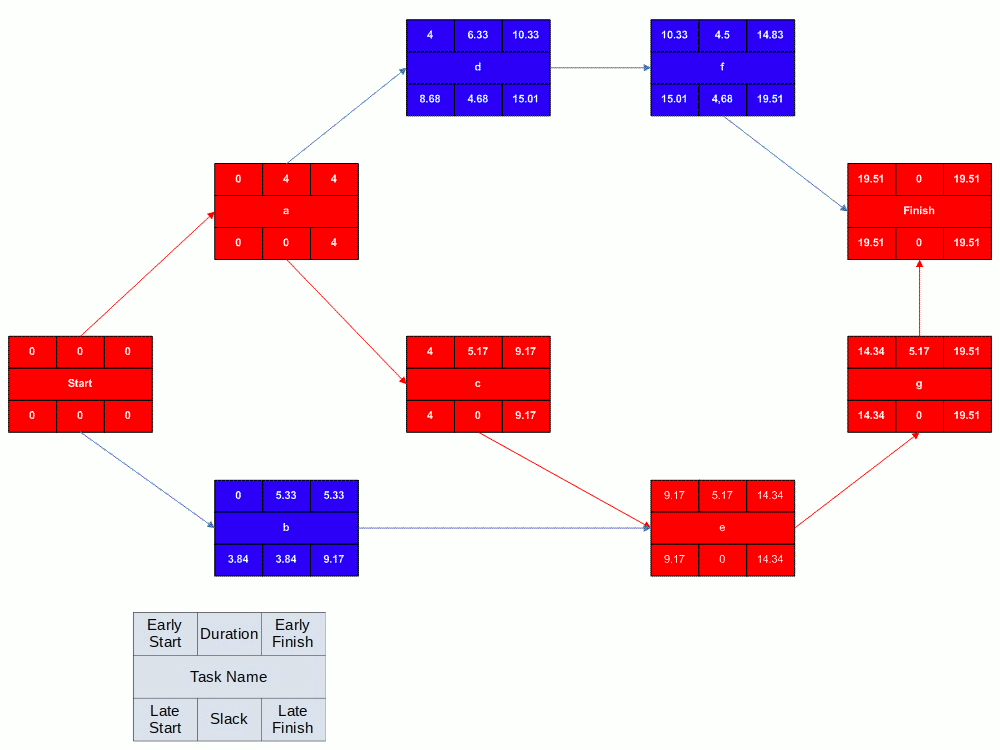 • '''예상 시간''': 모든 것이 항상 정상적으로 진행되는 것은 아니라는 사실을 고려하여 활동 또는 경로를 완료하는 데 필요한 최상의 추정 시간 (예상 시간은 작업을 장기간에 걸쳐 여러 번 반복할 경우 작업에 필요한 평균 시간이라는 의미).[7]