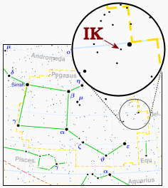 허블 우주 망원경으로 이 쌍성계를 구성하는 두 별을 각각 촬영하려 했으나, 두 별이 너무 가까워 분해하지 못했다.[134] 극자외선 우주 망원경을 이용한 더 정밀한 관측 결과 궤도 주기는 21.72168 ± 0.00009 일로 측정되었다.[135] 이 항성계의 궤도면 경사각은 지구에서 보았을 때 거의 90°에 가까울 것으로 추정된다. 만약 그렇다면 식을 관측할 수도 있을 것이다.[121]3. 페가수스자리 IK A