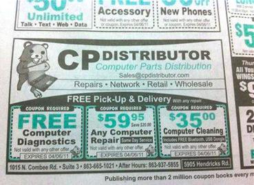 2011년 3월 22일, 블로그 Urlesque는 플로리다주 폴크 카운티에 있는 컴퓨터 수리 사업체인 "CP Distributor"의 쿠폰 책 광고 사진을 게시했는데, 이 광고에는 페도베어 이미지가 눈에 띄게 등장했다. "CP"는 페도베어 밈과 함께 사용될 경우 일반적으로 아동 포르노를 의미한다.[17]