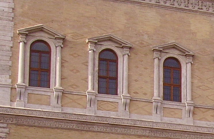 르네상스 시대에 창문 위에 페디먼트를 처음 사용한 것은 피렌체의 팔라초 바르톨리니 살림베니로, 바초 다뇰로가 1523년에 완공했다. 조르조 바사리에 따르면 이 혁신은 처음에는 조롱을 받았으나 나중에는 존경받으며 널리 채택되었다.[21] 바초는 ''팔라초''를 교회처럼 만들었다는 비난을 받기도 했다. 이 건물의 세 개 층 각각에 있는 창문(그리고 문) 위에는 정규 페디먼트와 분절 페디먼트가 번갈아 사용되었다. 파사드 상단에는 페디먼트 없이 일반적인 큰 코니스만 있다.[22]