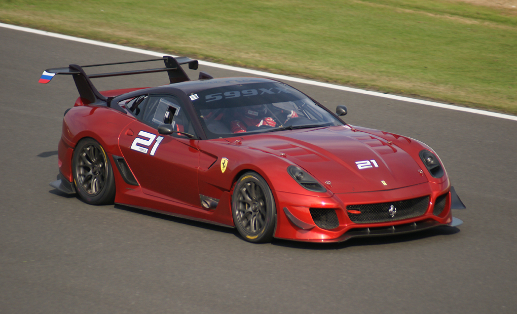 • 599XX: 2009년 제네바 모터쇼에서 공개된 599 GTB의 트랙 전용 모델이다.[25] 페라리 포뮬러 원 엔지니어들이 설계했으며, 일반 모델에 비해 많은 변화를 거쳤다. C필러의 두 개의 날개, 통풍 보닛, 어두운 렉산 테일 램프, 탄소 섬유 '덕테일' 리어 스포일러, 대형 리어 디퓨저, 전면 및 후면 견인 후크, 추가 덕트 등이 외관 개선 사항이다. 미니멀한 레이스 인테리어에는 롤 케이지와 렉산 슬라이딩 윈도우를 갖춘 레이싱 버킷 시트와 스티어링 휠 뒤의 LCD 디스플레이어가 포함되었다. 트렁크에 위치한 두 개의 팬은 차량을 지면에 유지하는 역할을 했으며, 155mph 속도까지 작동했다. 이 차량은 124mph에서 280kg의 다운포스를, 186mph에서 630kg의 다운포스를 발생시켰다. 에어컨 시스템은 유지되었다. 9가지의 트랙션 및 안정성 제어 모드, F1에서 영감을 받은 카본 세라믹 브레이크와 교차 드릴 로터, 새로운 레이스 배기 시스템이 장착되었다. 회전 제한기는 9,000rpm으로 상승했으며, 엔진은 9,000rpm에서 730PS으로 평가되었다. 탄소 섬유 흡기 매니폴드와 흑연 코팅 피스톤, 경량 크랭크샤프트와 같은 엔진 부품의 무게를 줄이고, 복합 재료 및 탄소 섬유 차체 부품을 사용하여 무게를 줄였다. 새로운 기어박스가 도입되어 전체 기어 변속 시간을 60밀리초로 단축했다. 29/67 R19 전면 및 31/71 R19 후면 레이싱 슬릭 타이어와 19 × 11J 전면 휠, 19 × 12J 후면 휠이 포함되었다. 에서 가속하는데 2.9초가 걸렸으며, 최고 속도는 196mph였다.[26] 2010년 베이징 국제 오토쇼에서 599XX가 뉘르부르크링의 노르트슐라이페 서킷을 6분 58.16초에 완주했다고 발표했다.[27]