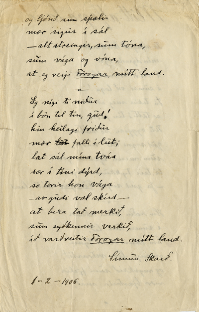 1906년 2월 1일, 클락스비크 남서쪽 포그룰리드 고등학교 교장 시문 아브 스카르디가 이 노래의 가사를 썼다.[1][2] 당시 페로 제도는 덴마크의 통치를 받고 있었는데, 보수파는 덴마크 통치 유지를, 자치주의자들은 자치 확대를 주장하며 갈등했다. 시문 아브 스카르디는 자치주의자였다.[1][2]1907년 9월 4일 저녁, 바이올리니스트 페투르 알베르그가 멜로디를 떠올리고 이 찬송가의 첫 악보를 작성했다.[1] 그는 로이팅에 전화하여 시문 아브 스카르디에게 멜로디를 불러주었고, 시문은 이를 마음에 들어 했다. 이후 페투르는 아이슬란드 아쿠레이리의 음악 교사에게 남성 4중창을 위한 화성을 부탁했다. 1907년 10월, 남성 4중창 편곡이 도착하여 가수들은 토르스하운의 슬론 홀에서 열리는 크리스마스 다음 날 콘서트를 위해 연습을 시작했다. 페투르는 노래 작곡자를 밝히지 않고, 가수들에게 요운 스베인손이라는 아이슬란드 사람이 작곡했다고 말했다. 이 노래는 1907년 12월 26일 콘서트에서 처음 공개 연주되었다.[1]