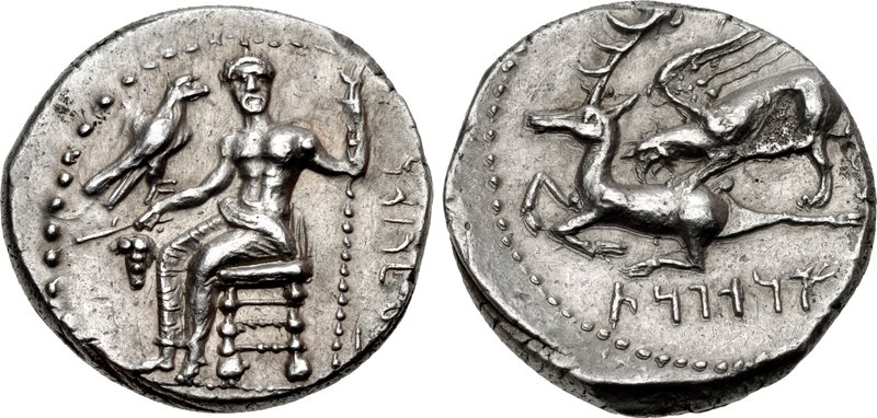 Head of Heracles left, wearing lion skin headdress / [BASILEWS FILIPPOU]. Zeus Aëtophoros seated right; wheel and monogram in left field, monogram below throne.