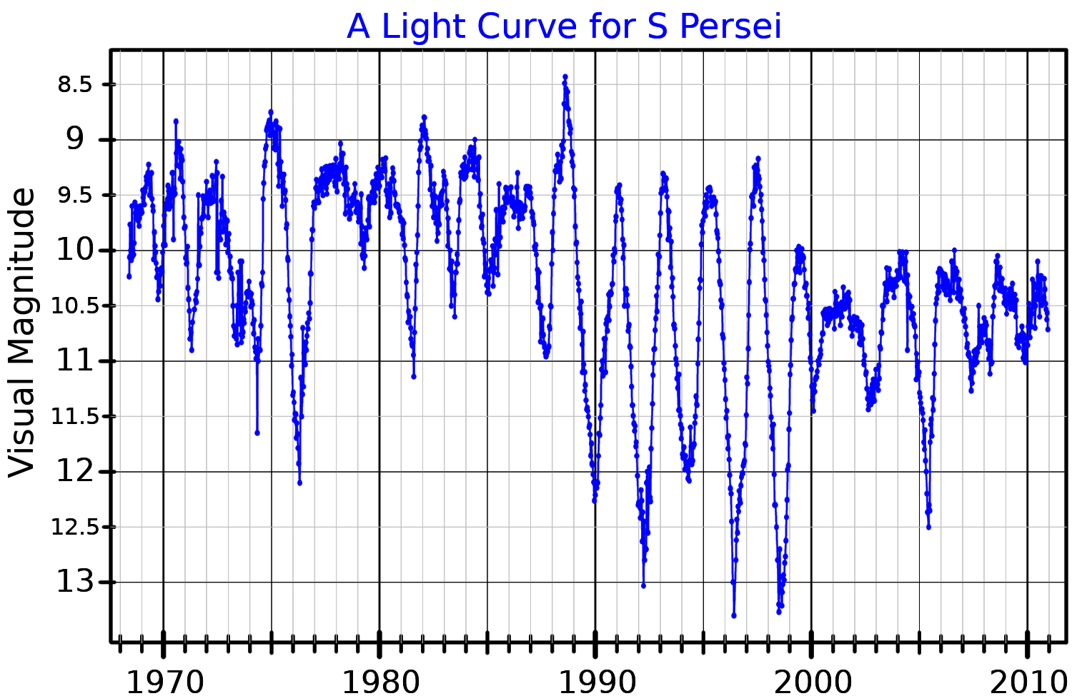 변광성 일반 목록에는 페르세우스자리 S의 밝기가 7.9등급에서 12.0등급 사이에서 변한다고 기록되어 있지만,[14][15] 이후 관측에서는 이보다 더 어두워진 사례도 보고되었다.
