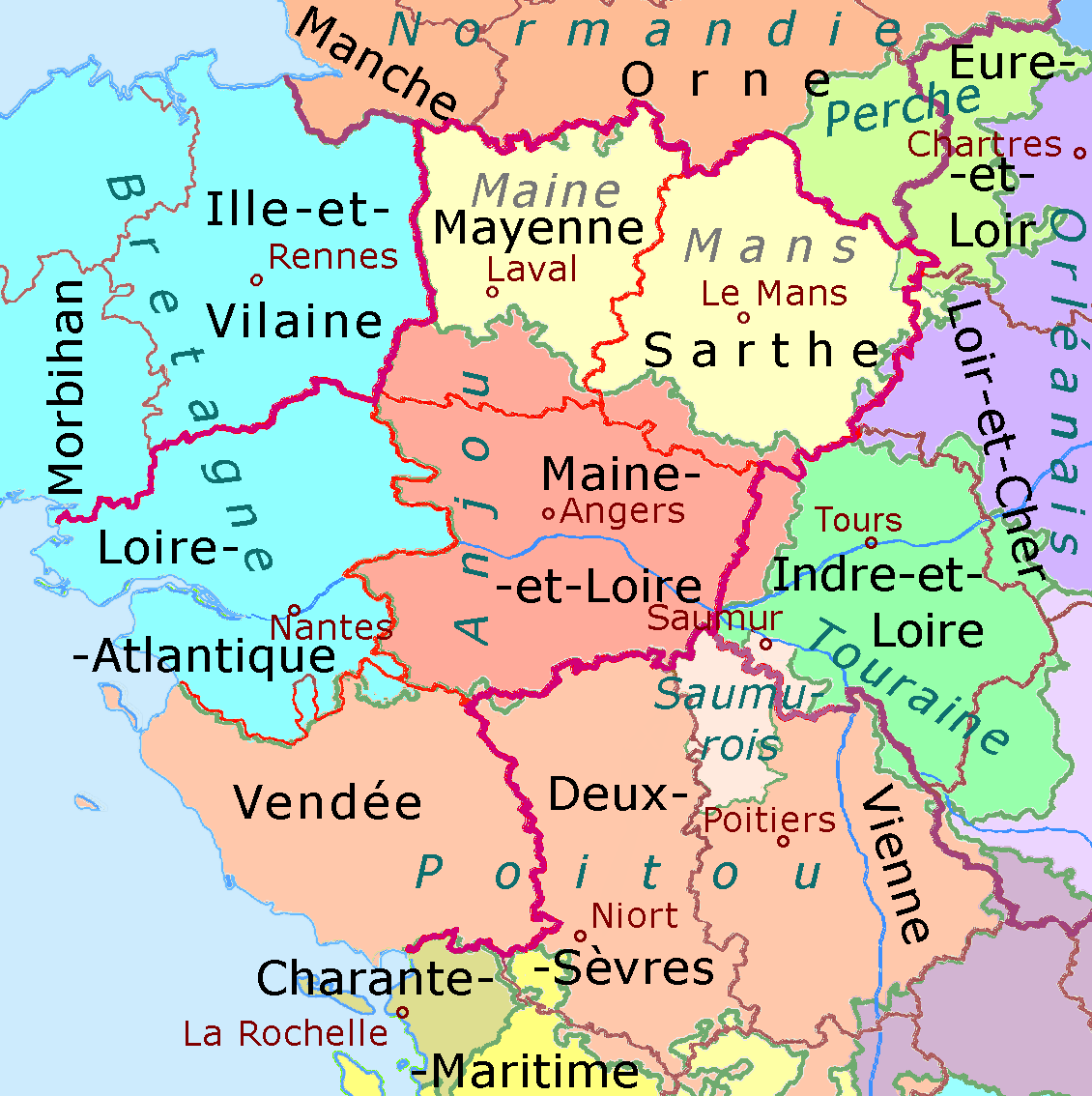 - 메인: 현재 마옌과 사르트 데파르트망으로 나뉘어 있으며, 옛 메인 지방 전체는 페이드라루아르 안에 포함되어 있다.