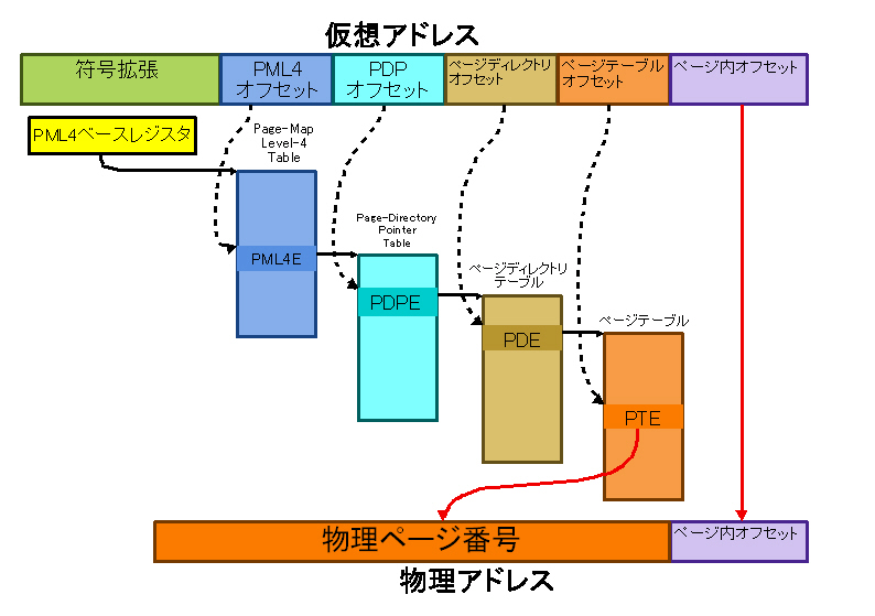 AMD64의 64비트 모드(4K 페이지)에서는 다단계 페이지 테이블을 통해 가상 주소를 물리 주소로 변환한다.