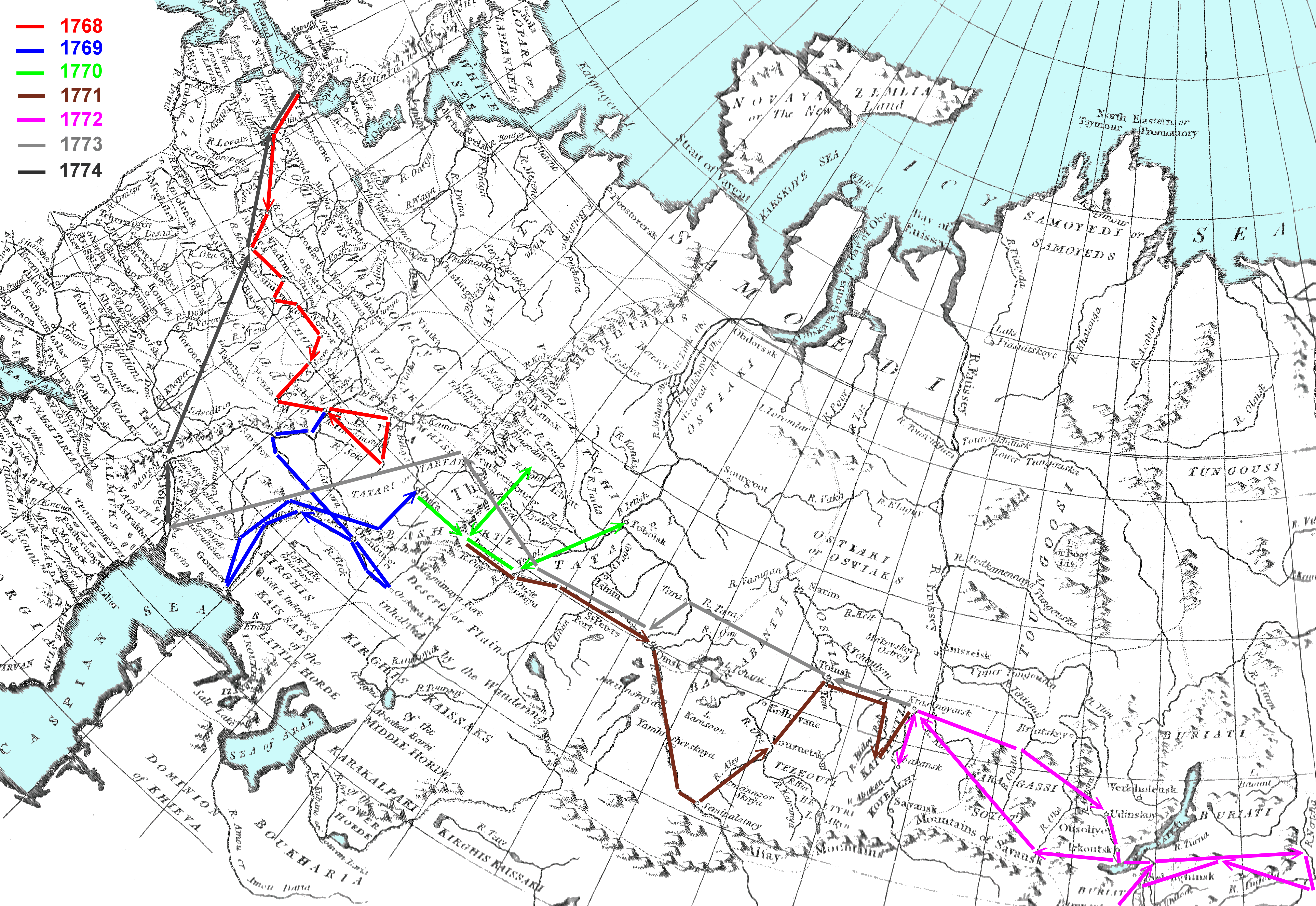 예카테리나 2세의 초청으로 1767년 상트페테르부르크 과학 아카데미 교수가 되었다.[2] 1768년부터 1774년까지 러시아 제국 중부 경제 지역, 볼가강 유역, 우랄 산맥, 서시베리아, 알타이 산맥, 자바이칼 지방 등 광범위한 지역을 탐험했다. 이 탐험을 통해 동식물 표본, 지리, 민족지학적 자료를 수집했다.