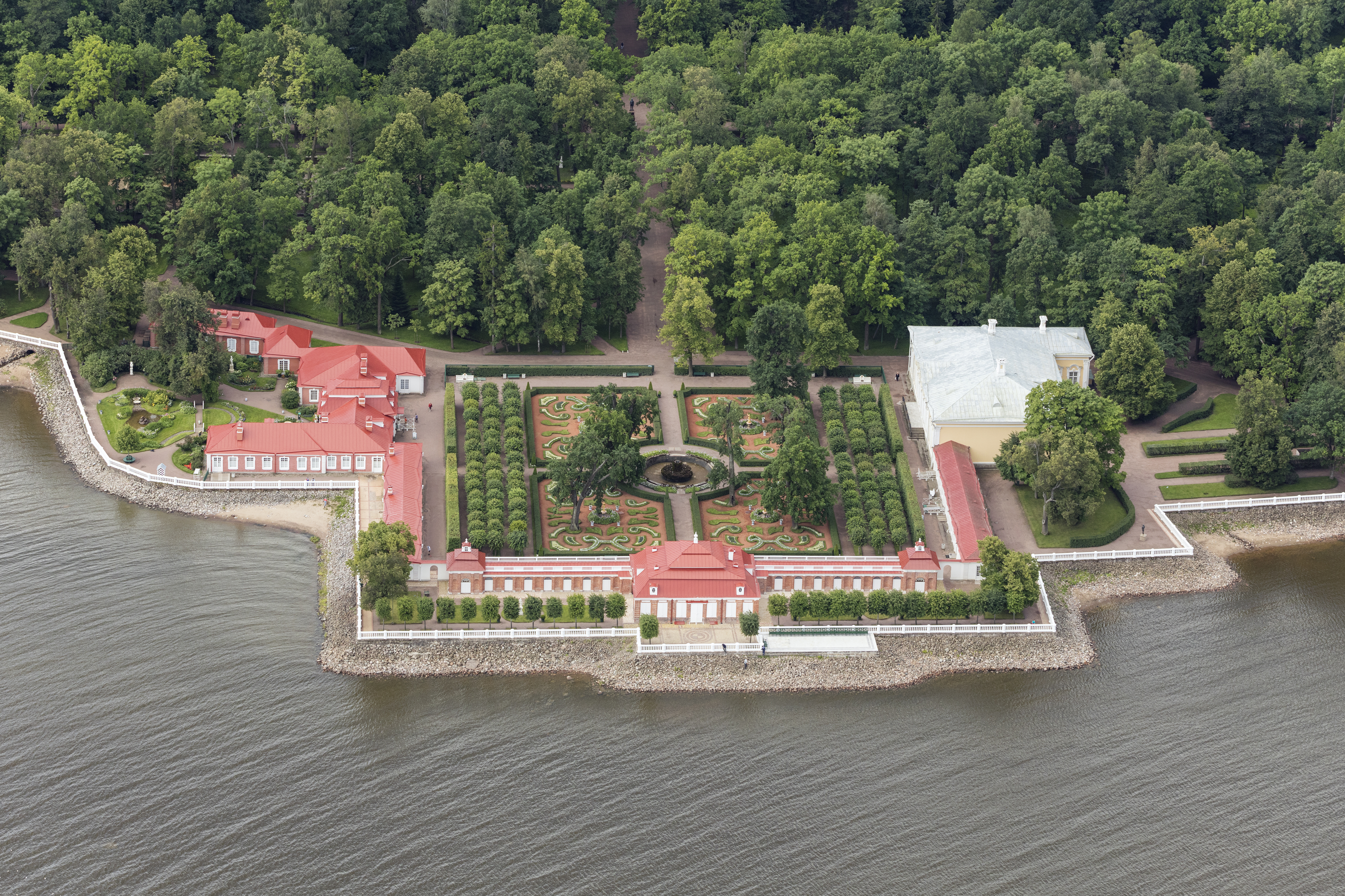 하부 정원 중앙 근처의 절벽 꼭대기에는 대궁전(''볼쇼이 드보레츠'')이 있다. 그 뒤(남쪽)에는 비교적 작은 상부 정원(''베르흐니 사드'')이 있다. 궁전 아래 절벽 면에는 대폭포(''볼쇼이 카스카드'')가 있다. 이것과 대궁전은 전체 단지의 중심부이다. 그 기슭에서 하부 정원을 가로지르는 바로크 시대의 가장 광범위한 수공 구조물 중 하나인 해로(''모르스코이 카날'')가 시작된다.