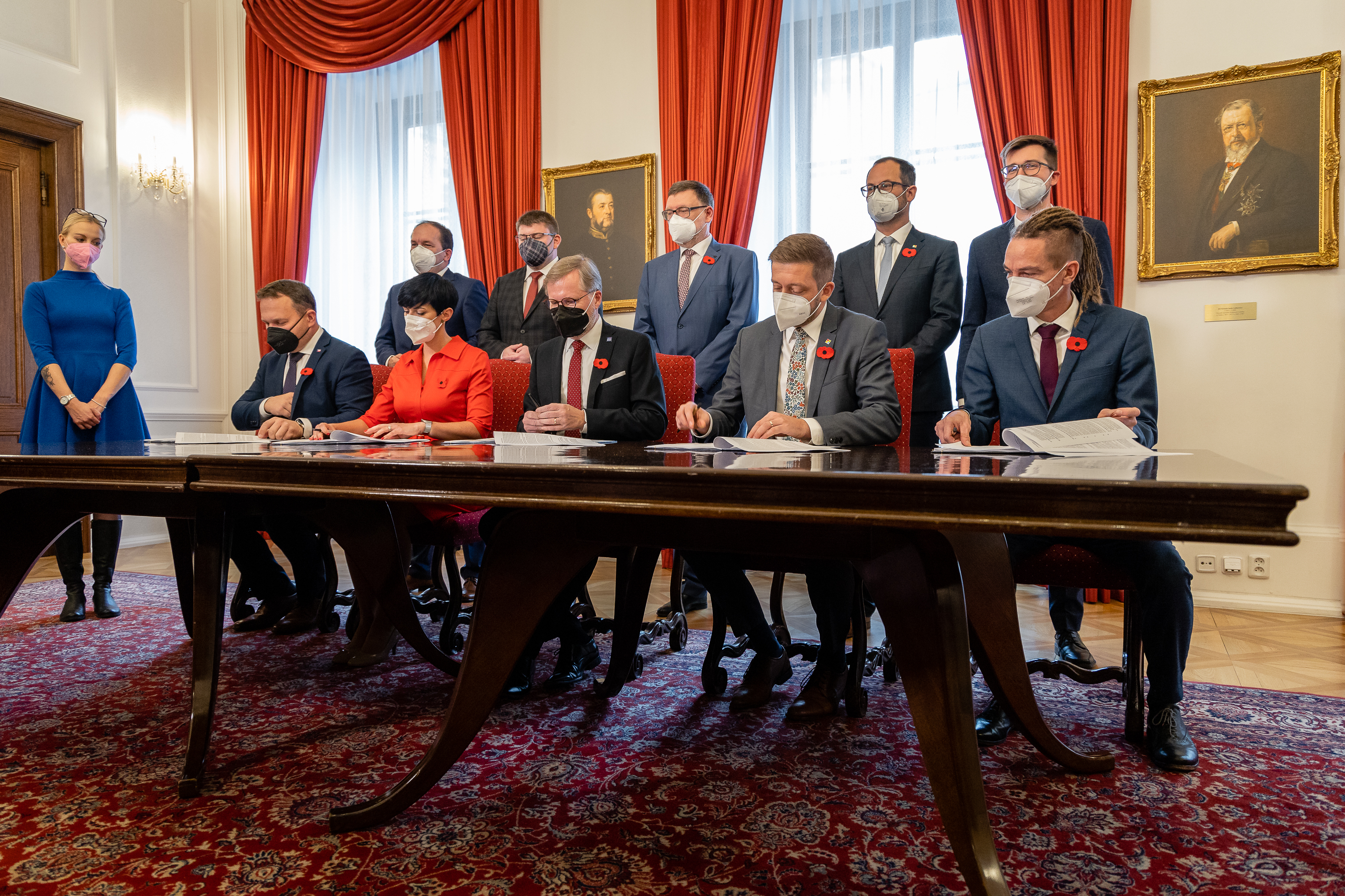 선거를 앞두고 여론 조사에서는 ANO 2011이 승리할 것으로 예상되었지만, 선거에서 SPOLU가 가장 많은 표를 얻었고, 야당이 하원에서 과반수 의석을 차지했다.[25] 야당들은 피알라를 총리 후보로 지명하기로 합의하는 각서에 서명했다.[26] 11월 8일, 자유보수주의 성향의 시민민주당부터 중도좌파 자유주의 성향의 해적당까지 5개 체코 정당이 새로운 중도우파 연정 구성을 위한 협약에 서명하고 예산 적자 감축을 약속했다.[27] 11월 9일, 밀로시 제만 대통령은 공식적으로 피알라에게 신정부 구성을 요청했다.[28] 2021년 11월 17일, 피알라는 제만 대통령에게 제안된 내각을 소개했고, 제만은 같은 해 11월 26일에 피알라를 새로운 총리로 임명하는 데 동의했다.[29] 2021년 11월, 피알라는 2022년 상원 및 지방 선거에서 SPOLU 연합을 계속 유지하고 싶다고 확인했다.[30]