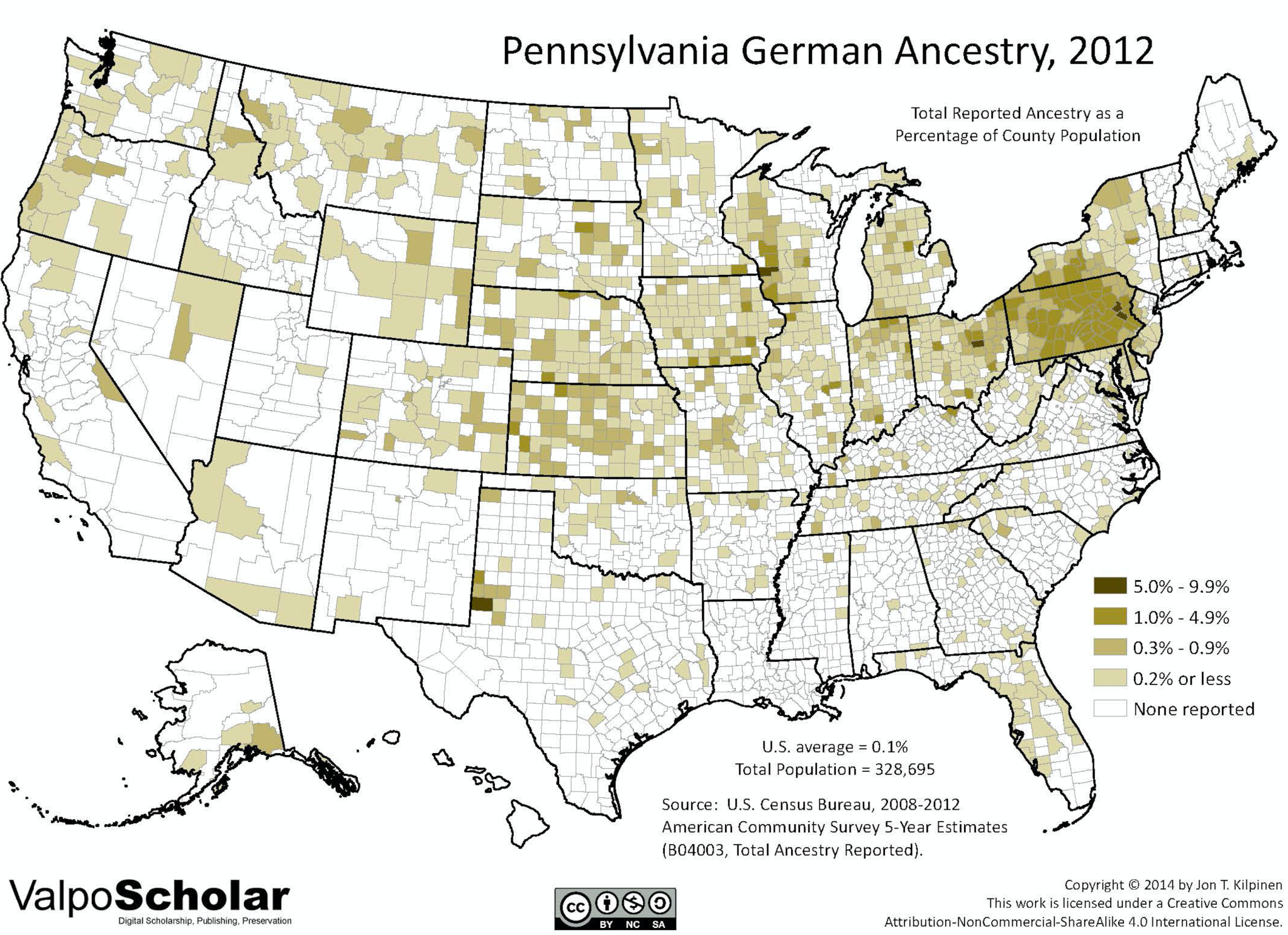 제1차 세계 대전과 제2차 세계 대전 사이의 반독일 감정으로 인해 펜실베이니아 더치어 사용은 구교 아미쉬와 구교 메노나이트와 같은 더 고립되고 전통적인 평민 사이를 제외하고 감소했다. 많은 독일 문화 관습이 현재 펜실베이니아에서 계속되고 있으며, 2008년 인구 조사에 따르면 독일인은 펜실베이니아 주민이 주장하는 가장 큰 조상이다.[82][48]