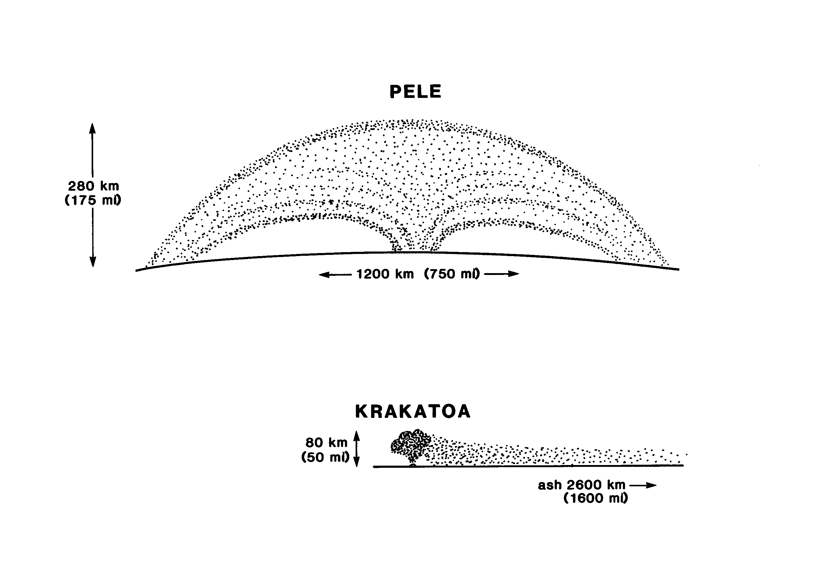펠레의 화산 분출은 간헐적이거나 주로 가스로 구성되어 있으며 때때로 먼지 함량이 증가하는 것으로 밝혀졌다. 이것은 1996년 12월과 2000년 12월 갈릴레오에 의해 두 번만 감지되었다.[2] 이 두 번의 감지에서 분출 높이는 300km에서 426km까지 다양했다.[2] 이 분출은 또한 갈릴레오가 이오를 근접 통과하는 동안 1999년 10월 허블 우주 망원경에 의해 감지되었다. 허블 관측을 통해 펠레의 분출에서 이오에서 처음으로 이원자 황(S2)이 감지되었다.[10]