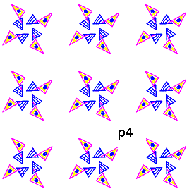 - '''p4''' 그룹은 4차 회전 중심(90°) 2개와 2차 회전 중심(180°) 1개를 가지고 있다. 반사나 글라이드 반사는 없다.