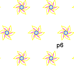 '''p6''' 군은 위수 6(60°)인 회전중심을 하나 가진다. 또한 위수 3(120°)인 회전중심 두 개를 가지는데, 이들은 60° 회전(또는 180°)으로 구분할 수 있다. 그리고 위수가 2(180°)인 회전중심 세 개를 가지며, 이들은 60° 회전으로 구분된다. 반사나 미끄럼반사는 존재하지 않는다.[1]이 대칭성을 가진 패턴은 C3 대칭성을 가진 동일한 삼각형 타일로 평면을 테셀레이션하거나, 또는 동등하게 C6 대칭성을 가진 동일한 육각형 타일로 평면을 테셀레이션한 것으로 볼 수 있다(타일의 가장자리는 반드시 패턴의 일부일 필요는 없다).[1]