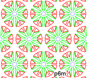 '''p6m''' 그룹은 위수가 6인 (60°) 회전 중심을 하나 가진다. 또한 위수가 3인 회전 중심 두 개를 가지는데, 이들은 60° 회전(또는 180°)으로 구분된다. 그리고 위수가 2인 회전 중심 세 개를 가지며, 이들은 60° 회전으로 구분된다. p6m은 또한 여섯 가지의 구분 가능한 방향으로의 반사가 존재한다. 그 각각의 여섯 가지 방향에 대해 미끄럼 반사 역시 존재하는데, 이 미끄럼 반사의 축은 평행하게 인접한 반사 축의 중간에 위치해 있다.이 대칭성을 가진 패턴은 이산면을 D3 대칭성을 가진 동일한 삼각 타일로 테셀레이션한 것으로 볼 수 있으며, 또는 동일하게는 D6 대칭성을 가진 동일한 육각형 타일로 평면을 테셀레이션한 것으로 볼 수 있다(타일의 가장자리는 반드시 패턴의 일부일 필요는 없다). 따라서 가장 간단한 예는 연결선이 있거나 없는 삼각 격자와 육각형의 윤곽선과 배경에 각각 하나의 색상을 사용하는 육각형 타일링이다.