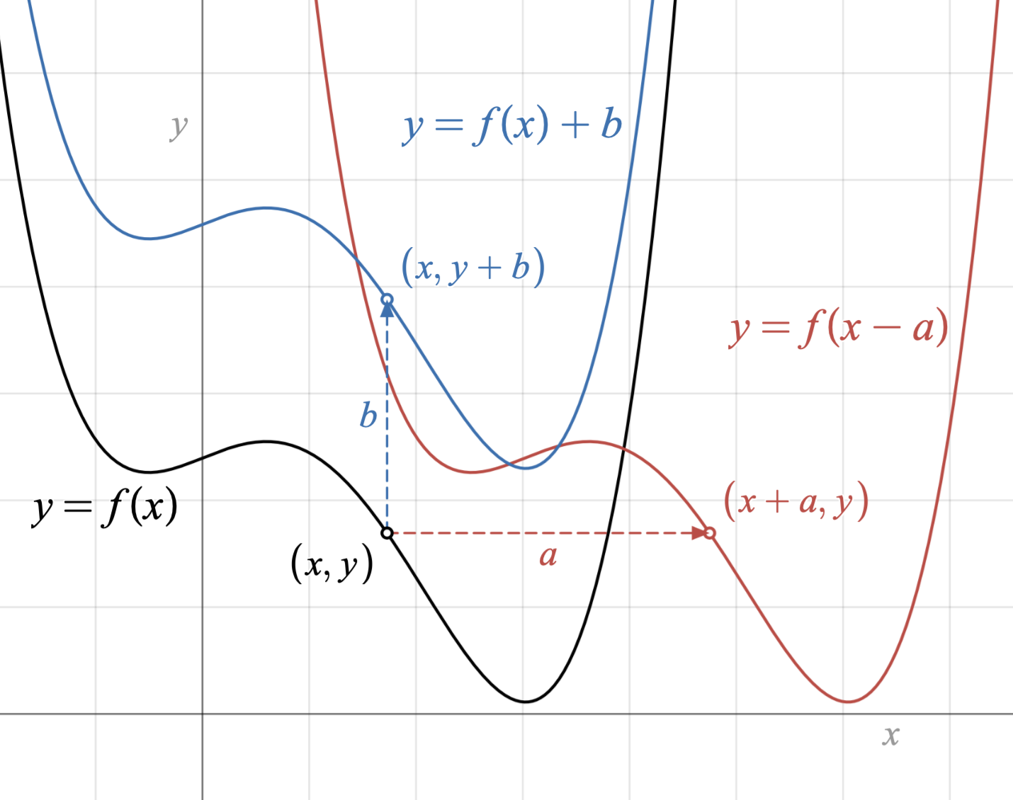 함수 ''f''의 그래프, 즉 점들의 집합 는 종종 ''x''를 수평 좌표로, 를 수직 좌표로 하여 실수 좌표 평면에 그려진다.'''수직 이동'''은 상수 ''b''에 대해 함수 와 ''f''를 합성하는 것을 의미하며, 결과적으로 점 로 구성된 그래프가 된다. 원래 그래프의 각 점 는 새 그래프의 점 에 해당한다.[3]