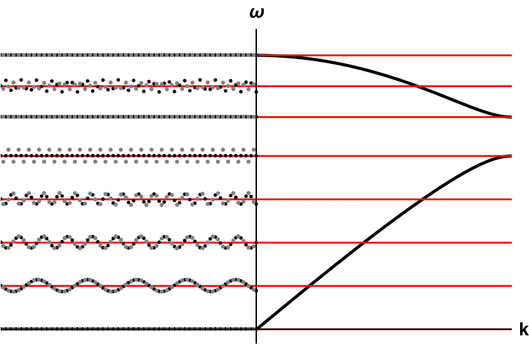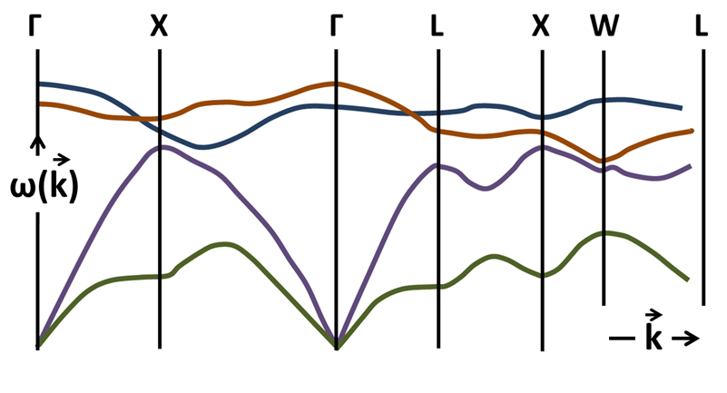 여기서 는 각 모드의 각진동수이며, 파수 에 따라 달라진다. 이 관계를 포논의 '''분산 관계'''라고 한다.