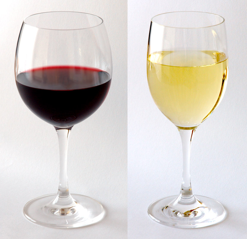 - 레드 와인: 투명한 빨강이나 진한 자주색, 또는 적갈색의 와인을 레드 와인이라고 부른다. 일반적으로 화이트 와인보다 떫은맛의 성분인 탄닌을 많이 함유하고 있어 장기 보관이 가능하다. 주로 검은 포도나 붉은 포도를 원료로 하며, 과일을 통째로 알코올 발효시킨다. 이 발효 과정에서 과피에 포함된 색소와 탄닌이 추출된다. 말로락틱 발효에 의해 산도가 줄어드는 경우가 많다. 진한 풍미의 것은 일반적으로 고기 요리에 어울린다고 여겨진다. 또한 차게 하면 향의 성분이 휘발하기 어려워지거나 쓴맛이 증가하기 때문에, 차갑게 하지 않는 것이 일반적이다. 일반적으로 레드 와인에는 드라이 와인만 있으며, 농후함과 탄닌에 따라 라이트 바디부터 풀 바디까지 분류된다. 화이트 와인과 달리, 마시는 사람의 체질과 와인의 종류에 따라 심한 두통을 일으킬 수 있다. 그 원인은 티라민이나 히스타민이 많기 때문이라고도 하지만, 히스타민의 함유량은 다른 발효식품과 비교하여 많지 않다.[164] 또한, 플라보노이드류에 의해 천식의 중증화와는 유의미한 역의 상관관계가 나타나고 있다.[165]