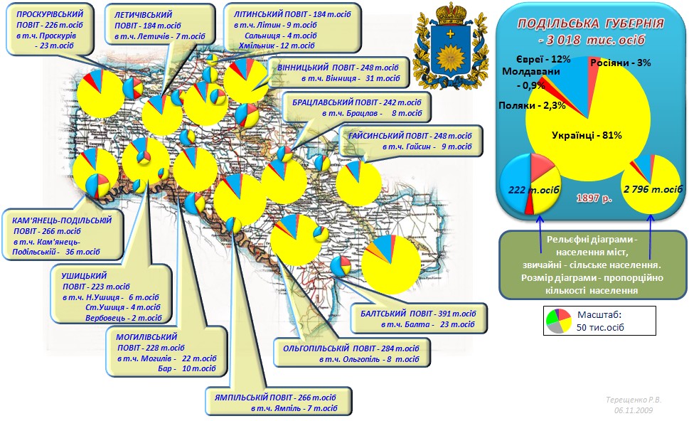 1897년 러시아 인구 조사에 따르면 포돌리아현의 주요 도시와 인구 구성은 다음과 같다.
