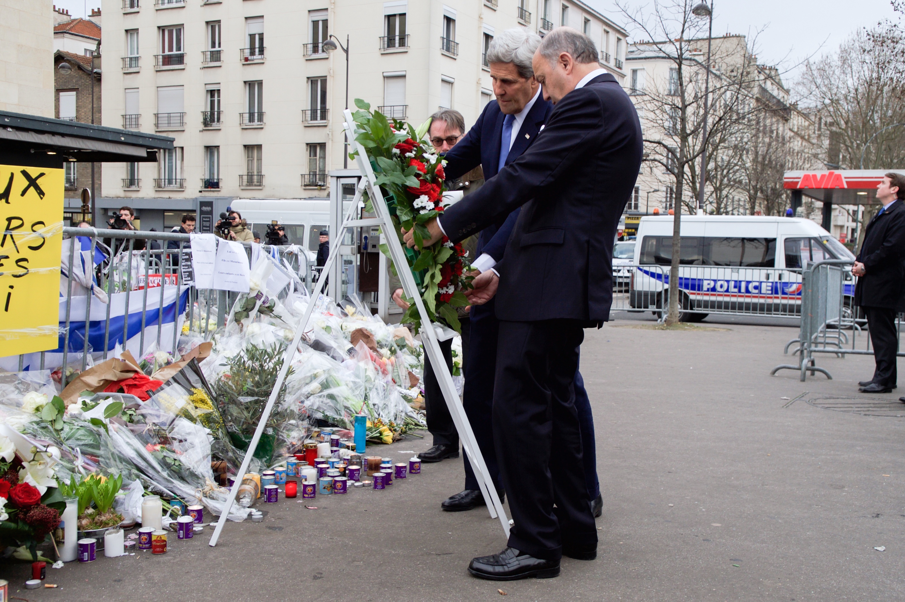 미국 국무장관 존 케리와 프랑스 외무장관 로랑 파비우스가 현장 밖에서 화환을 정리하는 모습