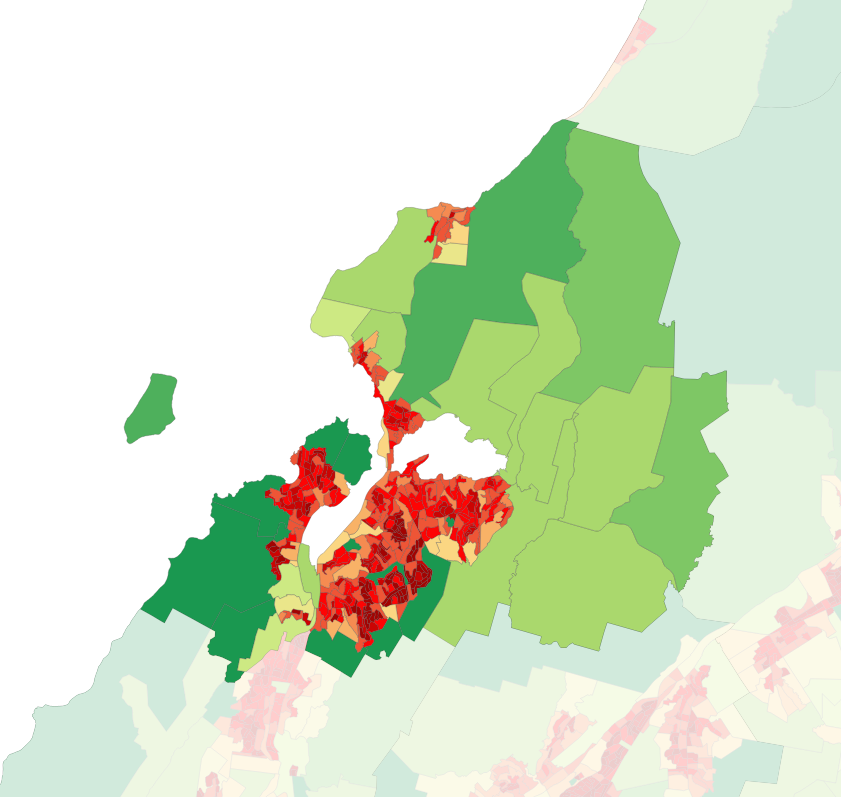 | 구역 | 면적 (km2) | 인구 | 밀도 (명/km2) | 주택 | 중앙값 연령 | 중앙값 소득 |