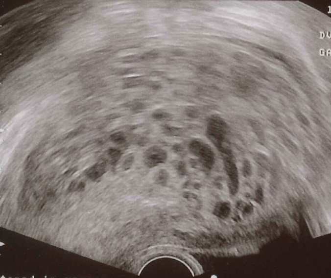 초음파 사진에서 기태는 포도송이("포도송이 떼", "벌집 자궁", "눈보라")와 유사하게 나타난다.[14] CT 촬영을 통해 자궁강 내에 과립상의 구조가 관찰된다.