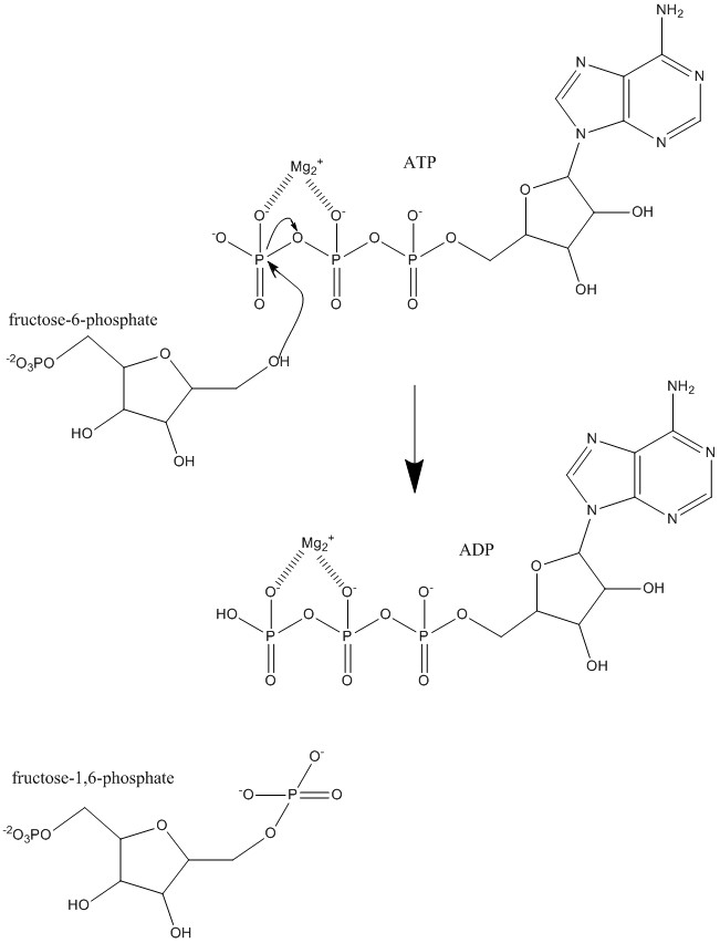 PFK-1 반응에서 1번 탄소의 하이드록실 산소는 ATP의 β 인산에 친핵성 공격을 한다. 이 전자는 ATP의 β 인산과 γ 인산 사이의 무수물 산소로 이동한다.