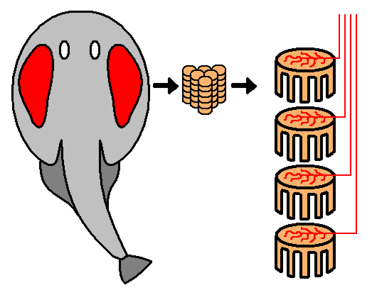먹이의 분포는 종종 뭉쳐져 있으며, 포식자는 먹이가 밀집된 '덩어리'를 찾고 그 안에서 탐색하는 방식으로 대응한다.[25] 예를 들어, 검은눈알바트로스는 번식하는 새가 새끼를 위해 먹이를 모으기 위해 정기적으로 약 700km 범위까지 먹이 탐색 비행을 하며, 최대 먹이 탐색 범위는 3000km에 이른다.[29] 정적인 먹이의 경우, 일부 포식자는 적합한 덩어리 위치를 학습하여 먹이를 먹기 위해 간헐적으로 돌아올 수 있다.[30]