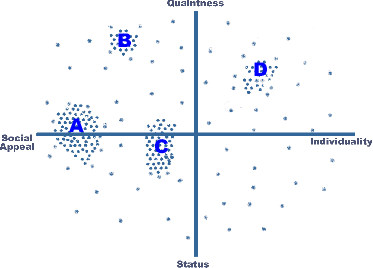 다음은 포지셔닝 분석에 유용한 통계적 절차들이다.- 군집 분석[35] (중첩 군집 분석 포함)[36]