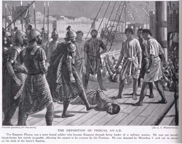 608년경, 카르타고 총독 헤라클레이오스가 포카스에 대항해 반란을 일으켰다. 610년 10월, 수도는 항복했다. 포카스는 교회로 도망쳤지만 끌려 나와 처형되었고, 그의 일족도 몰살당했다. 이후 소(小) 헤라클레이오스가 새로운 황제로 즉위했다(헤라클레이오스 왕조의 성립).