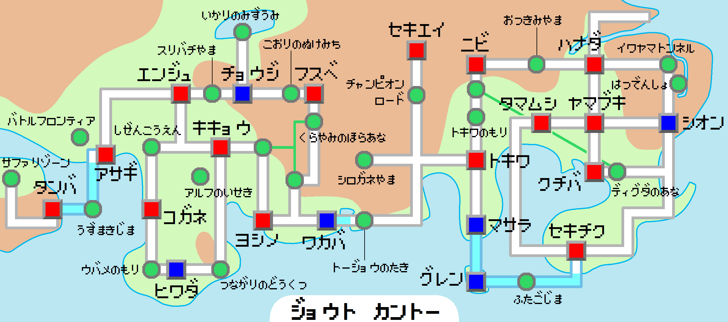 본 작품은 관동지방을 무대로 하며, 『'''파이어레드·리프그린'''』, 『'''Let's Go! 피카츄·이브이'''』의 무대이기도 하다. 루비·사파이어·에메랄드, 다이아몬드·펄·플래티넘, 블랙·화이트에서도 이름만 등장한다. 이름 그대로 일본의 관동 지방이 모티브[182]가 되어 있지만 일부는 중부 지방도 포함된다.