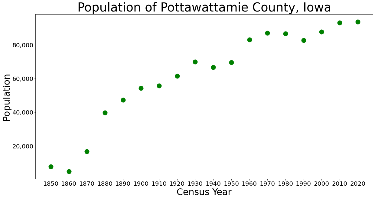 다음 표의 인구 순위는 포타와타미군(Pottawattamie County)의 2020년 인구 조사를 기준으로 한다.[1]