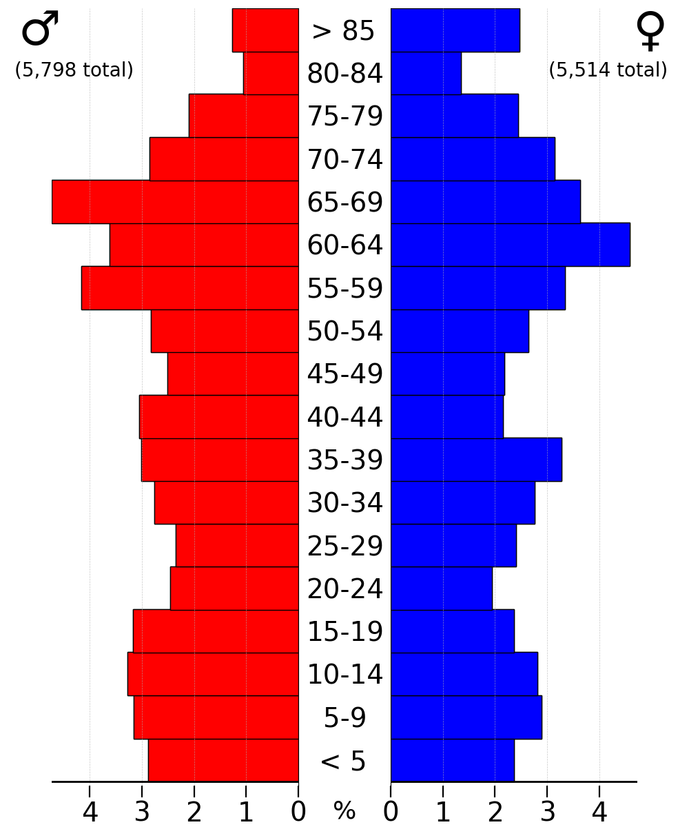 연령별 분포는 18세 미만 24.80%, 18~24세 6.70%, 25~44세 23.10%, 45~64세 23.80%, 65세 이상 21.50%였다. 중간 연령은 42세였다. 여성 100명당 남성 96.90명, 18세 이상 여성 100명당 남성 92.90명이었다.