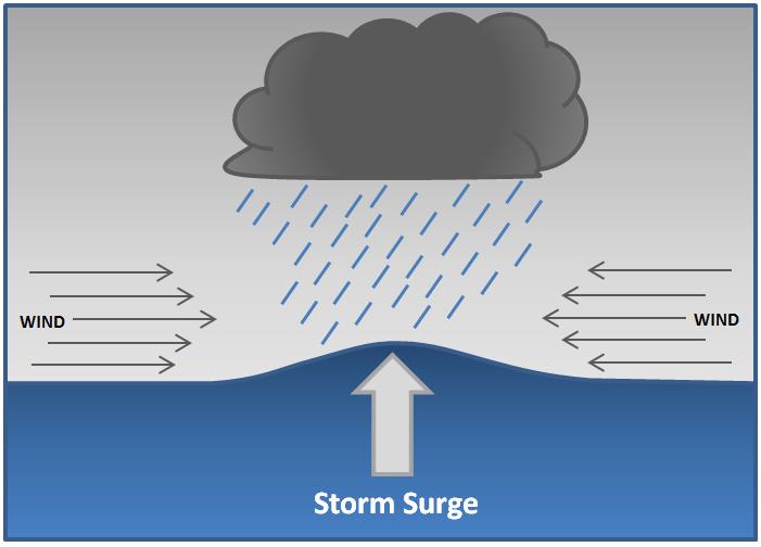 이러한 차이는 폭풍 해일이 얼마나 많은 흐름 면적에 분산될 수 있는지에 기인한다. 더 깊은 물에서는 더 넓은 면적이 있어 해일이 아래로 분산되어 허리케인에서 멀어질 수 있다. 얕고 완만하게 경사진 대륙붕에서는 해일이 분산될 공간이 적어 허리케인의 풍력에 의해 해안으로 밀려온다.[4]