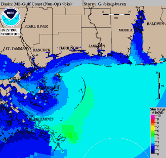 미국 국립 허리케인 센터(NHC)는 SLOSH 모델을 사용하여 폭풍 해일을 예측한다. SLOSH는 "허리케인으로 인한 해양, 호수 및 육상 해일(Sea, Lake and Overland Surges from Hurricanes)"의 약자이다. 이 모델은 20% 이내의 정확도를 보인다. SLOSH의 입력값에는 열대 저기압의 중심 기압, 폭풍 크기, 사이클론의 전진 속도, 진로 및 최대 지속 풍속이 포함된다. 지역 지형, 만과 강의 방향, 해저 깊이, 천문 조위, 기타 물리적 특징은 SLOSH 유역이라고 하는 미리 정의된 격자에 고려된다. 미국의 남부 및 동부 해안선에는 SLOSH 유역이 중첩되어 정의되어 있다. 일부 폭풍 시뮬레이션은 둘 이상의 SLOSH 유역을 사용한다. 예를 들어, 허리케인 카트리나 SLOSH 모델 실행은 폰차트레인 호 / 뉴올리언스 유역과 미시시피 사운드 유역을 모두 사용하여 멕시코만 북부에 상륙했다. 모델 실행의 최종 출력은 각 위치에서 발생한 최대 수위 외피(MEOW)를 표시한다.