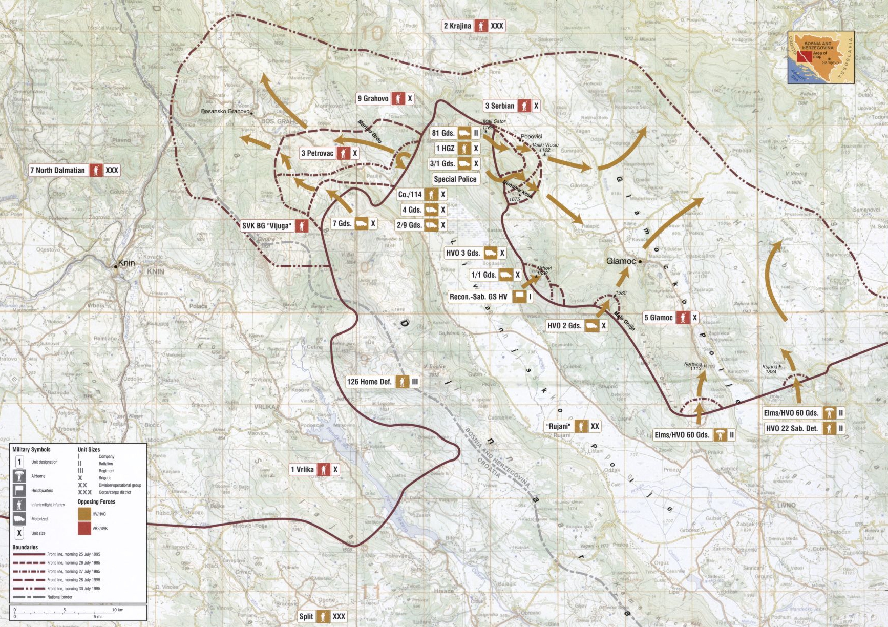1995년 7월, 크로아티아군과 보스니아 헤르체고비나군은 합동으로 글라모치, 보산스코그라호보, 리브노 서쪽 마을들을 점령했다. 이로써 보스니아 영내 세르비아인 지역에서 크라이나 수도 크닌으로 이어지는 간선 도로가 차단되었고, 크닌은 세 방향에서 포위되는 상황에 놓였다.