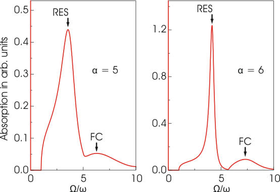 사이클로트론 공명 실험으로 측정할 수 있는 폴라론 질량 는 자체 유도 분극이 없는 전하 운반체의 띠 질량 ''''보다 크다.[20]
