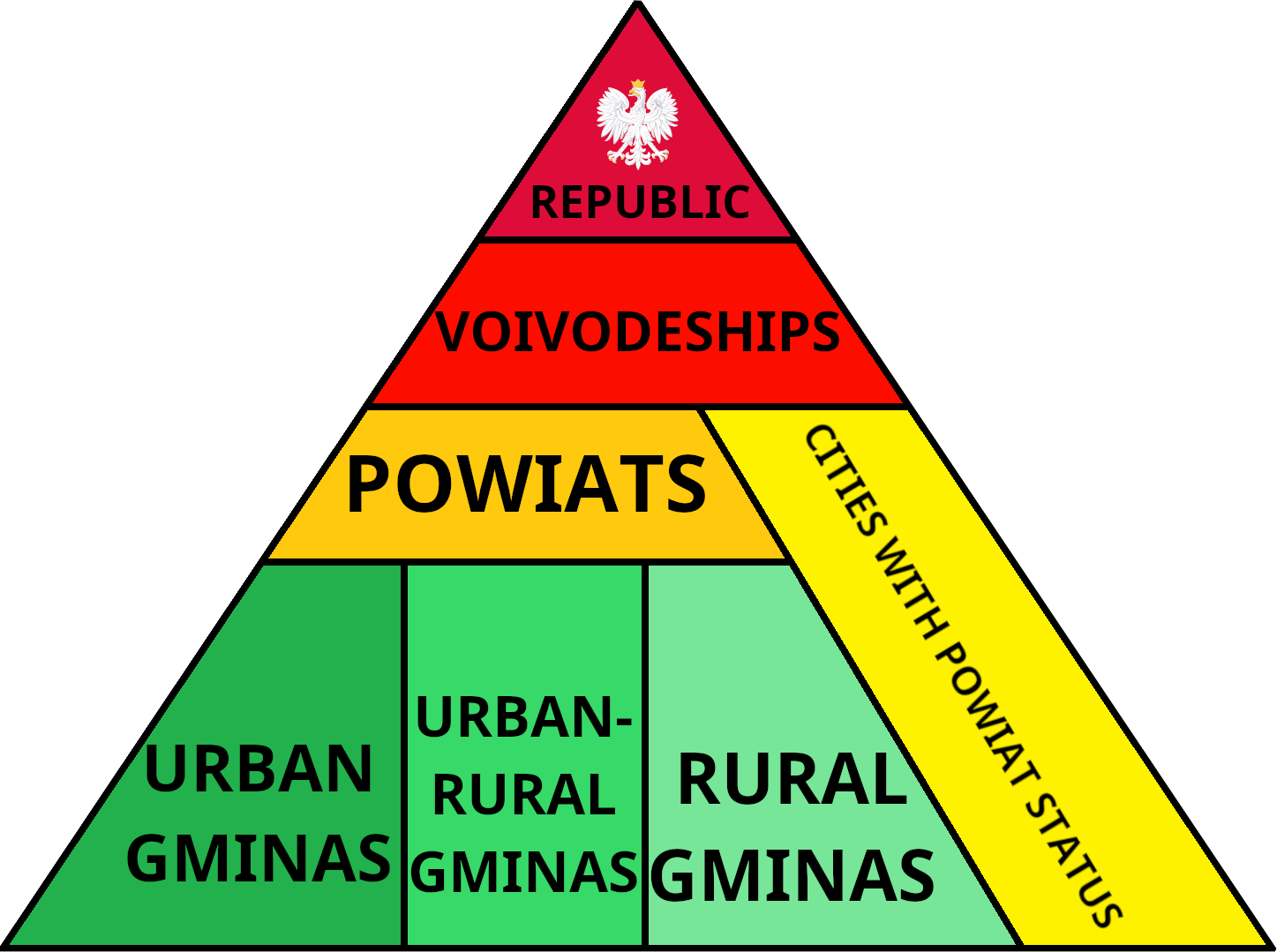 도시형 지자체 ('gmina miejska'): 도시('miasto')로 이루어진다. 302개가 있다.
