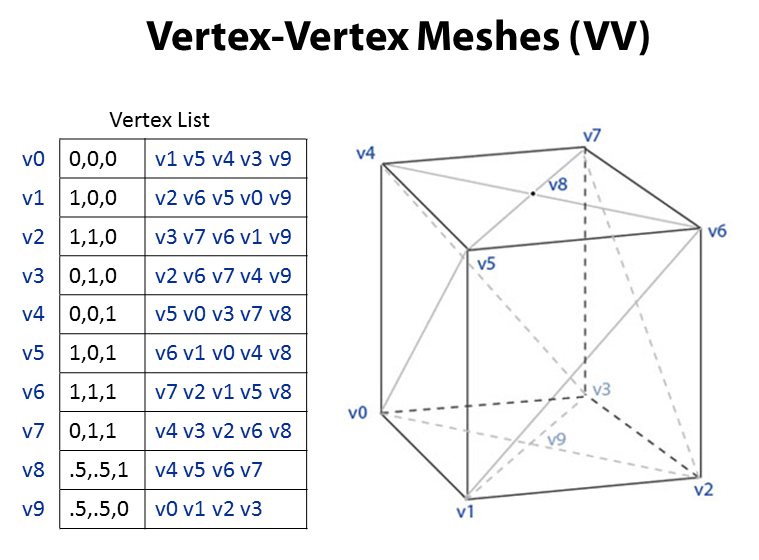 '''정점-정점 메시'''(Vertex-Vertex Meshes, VV)는 객체를 다른 정점에 연결된 정점 집합으로 나타낸다. 가장 간단한 표현이지만, 면과 변(변) 정보가 암시적이어서 널리 사용되지는 않는다. 따라서 렌더링을 하려면 면 목록을 만들기 위해 데이터를 순회해야 한다. 또한, 변과 면에 대한 연산은 쉽게 수행할 수 없다.[2]VV 메시는 저장 공간이 작고 형태 변환이 효율적이라는 장점이 있다. 위 그림은 VV 메시로 표현된 사면 상자를 보여준다. 각 정점은 인접한 정점을 가리킨다. "상자-실린더"의 상단과 하단 중앙에 있는 마지막 두 정점 8과 9는 4개의 연결된 정점을 갖는다(5개가 아님). 일반적인 시스템은 주어진 정점에 연결된 임의의 수의 정점을 처리할 수 있어야 한다.[2]