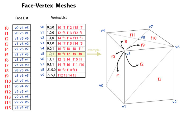 렌더링할 때 면 목록은 일반적으로 정점에 대한 인덱스 집합으로 GPU에 전송되고, 정점은 위치, 색상, 법선 구조로 전송된다 (그림에서는 위치만 제공됨). 이를 통해 형상의 변화는 면 연결성을 업데이트하지 않고 정점 데이터만 다시 전송하여 동적으로 업데이트할 수 있다는 이점이 있다.
