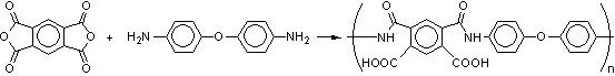 테트라카복실산 이무수물과 다이아민을 원료로 사용하여 중합 반응을 통해 폴리이미드의 전구체인 폴리아믹산(폴리아미드산, polyamic acid영어)을 얻는다.