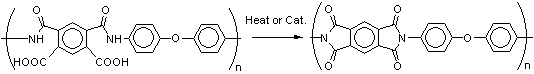 이 폴리아믹산을 200℃ 이상으로 가열하거나 촉매를 사용하여 탈수 및 고리화(이미드화) 반응을 진행시켜 폴리이미드를 얻는다. 촉매를 사용하는 경우에는 아민계 화합물이 많이 사용되며, 이미드화 과정에서 생성되는 물을 빠르게 제거하기 위해 카르복실산 무수물을 함께 사용하기도 한다.