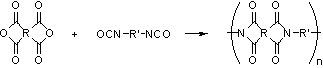 폴리이미드는 주로 다음과 같은 방법으로 제조된다.이러한 반응에 사용되는 이무수물에는 피로멜리트산 이무수물, 벤조퀴논테트라카복실산 이무수물, 나프탈렌테트라카복실산 이무수물 등이 있다. 일반적인 다이아민 구성 요소에는 4,4'-옥시다이아닐린, m-페닐렌다이아민(MDA), 3,3-다이아미노다이페닐메테인이 있다.[25] 수백 가지의 다이아민 및 이무수물들은 이러한 물질들의 물리적 특성, 특히 가공 특성을 조정하기 위해 조사되었다.[26]